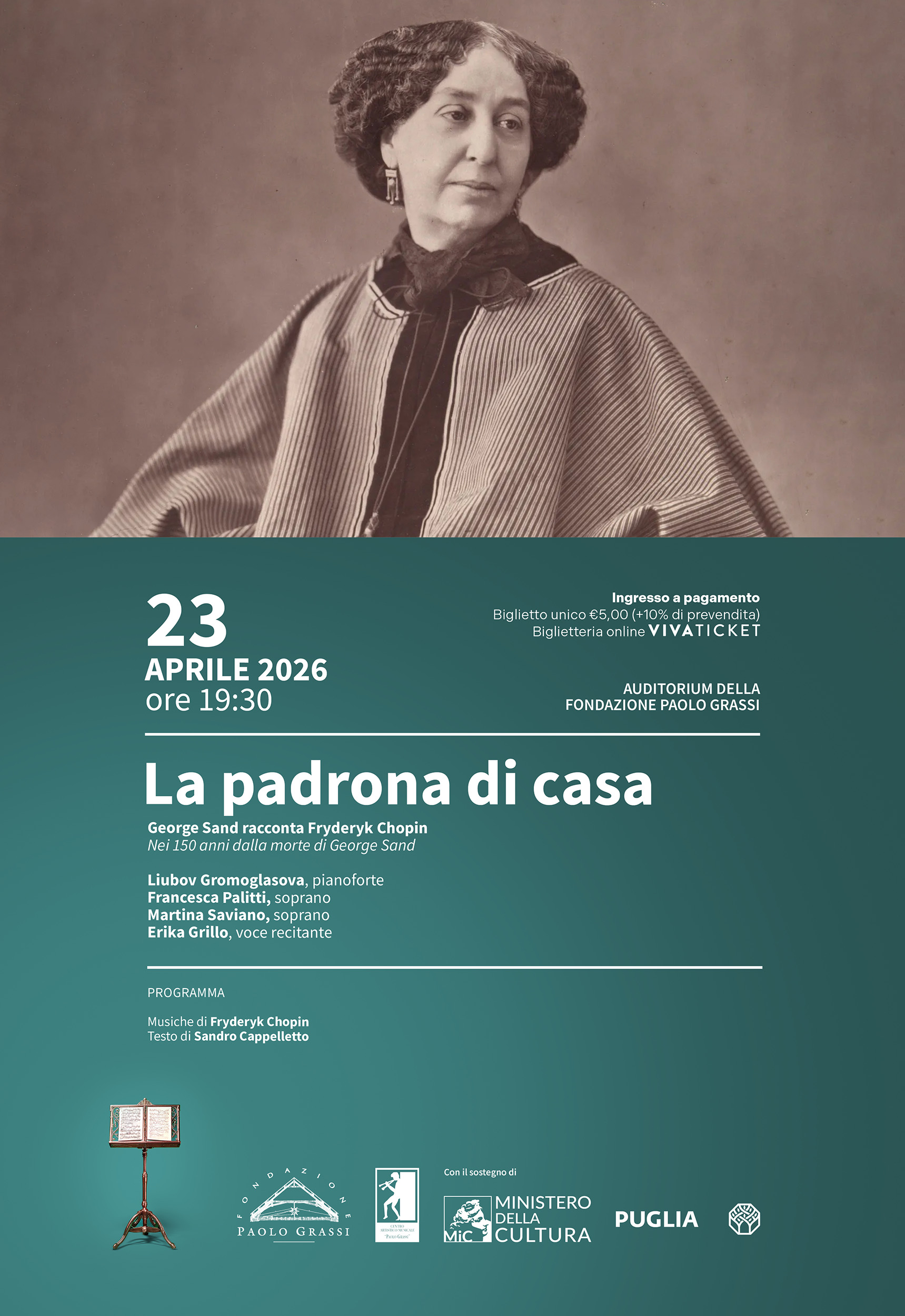 George Sand descrive Fryderyk Chopin come un genio tormentato, un “angelo” fragile, la cui musica sublimava la sofferenza fisica e interiore, specialmente durante il difficile soggiorno a Maiorca. La scrittrice, che fu sua amante e protettrice per quasi nove anni (1838-1847), lo curò devotamente, descrivendo il suo processo creativo come una trasformazione del dolore in arte pura. Nel 150° anniversario della morte di Georgie Sand, Sandro Cappelletto ha realizzato un testo che, muovendo dalle opere della scrittrice e drammaturga francese, racconta il più famoso e tormentato dei suoi amori, alternandosi con l’esecuzione di brani pianistici e delle canzoni polacche del grande Chopin.