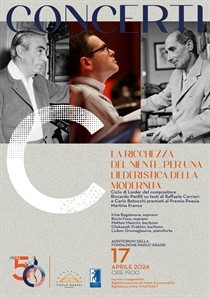 I due cicli di Lieder in prima esecuzione assoluta, “La ricchezza del Niente” per baritono e pianoforte e “La nottola di Minerva” per soprano e pianoforte, sono ispirati alle omonime raccolte poetiche di Raffaele Carrieri e di Carlo Betocchi – premiati al Premio Martina Franca di Poesia rispettivamente nel 1981 e 1980 – e sono stati comissionati dalla Fondazione Paolo Grassi appositamente per le voci degli allievi dell’Accademia del Belcanto “Rodolfo Celletti”.
