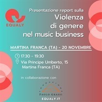 Lunedì 20 novembre alle 17.30 nell’Auditorium della Fondazione Paolo Grassi EQUALY, prima realtà italiana ad occuparsi di parità di genere nell’industria musicale nazionale, presenta il report sul questionario legato alla violenza di genere nel music business realizzato in collaborazione con la Dottoressa in Sociologia del Lavoro Rebecca Paraciani.